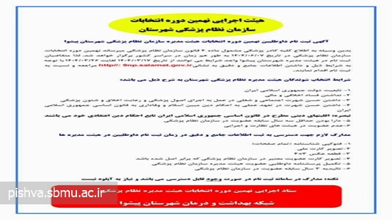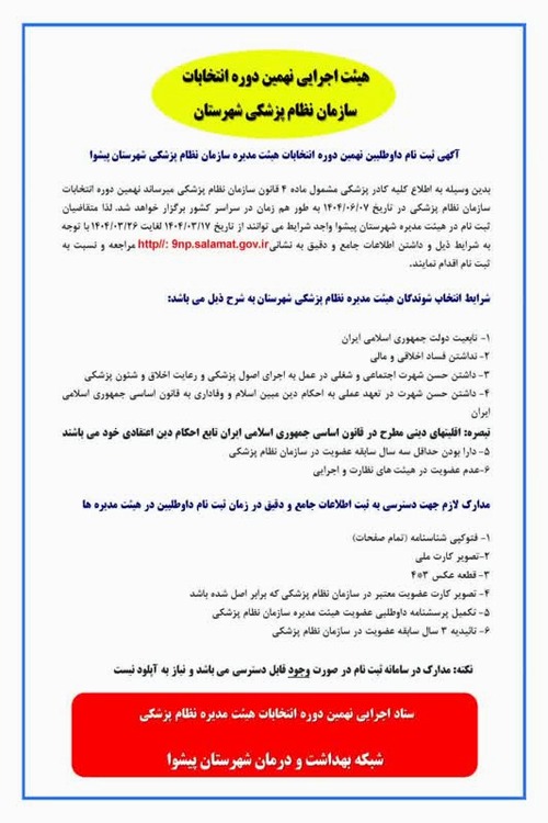 آگهی ثبت نام داوطلبین هیئت مدیره نظام پزشکی شهرستان پیشوا