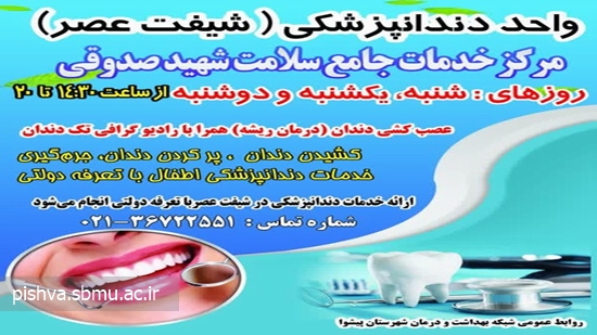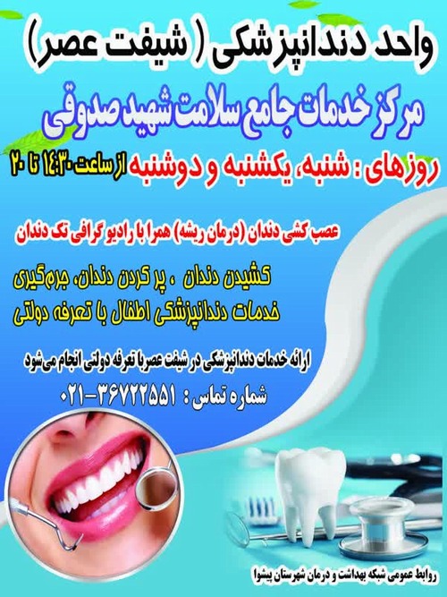 واحد دندانپزشکی (شیفت عصر) مرکز خدمات جامع سلامت شهید صدوقی/ شهرستان پیشوا