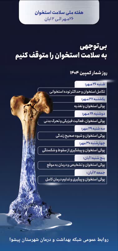 هفته ملی سلامت استخوان از ۲۶ مهر تا ۲ آبان ۱۴۰۴ با شعار: بیتوجهی به سلامت استخوان را متوقف کنیم