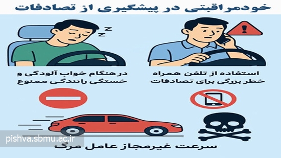 "سرعت خود را کم کنید"، "سبقت غیرمجاز ممنوع"، "تلفن همراه در حین رانندگی ممنوع"، "استراحت کنید"